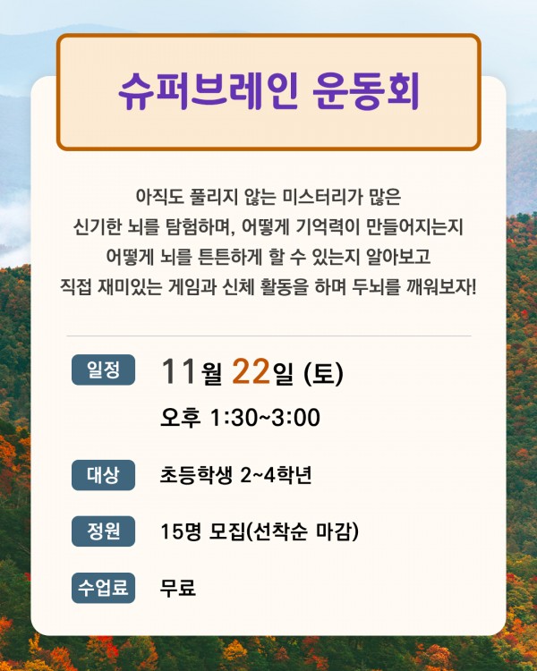 도담도담 토요 아카데미, 원데이 특강 페이지 정보 작성자관리자 댓글 0건 조회 1회 작성일 25-10-23 16:01 본문 날짜 : 2025-11-22 목록 이전글도담도담 일요 아카데미, 원데이 특강 25.10.23 다음글책맥캠핑[맥주와 인문학이야기] 25.10.23 댓글목록 댓글목록 등록된 댓글이 없습니다.
