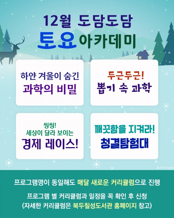 도담도담 토요 아카데미 페이지 정보 작성자관리자 댓글 0건 조회 6회 작성일 25-11-20 17:35 본문 날짜 : 2025-12-06 목록 이전글도담도담 토요 아카데미, 북두칠성도서관으로 나랑 별보러 가지않을래? 25.11.20 다음글정기 휴관일 25.11.20 댓글목록 댓글목록 등록된 댓글이 없습니다.