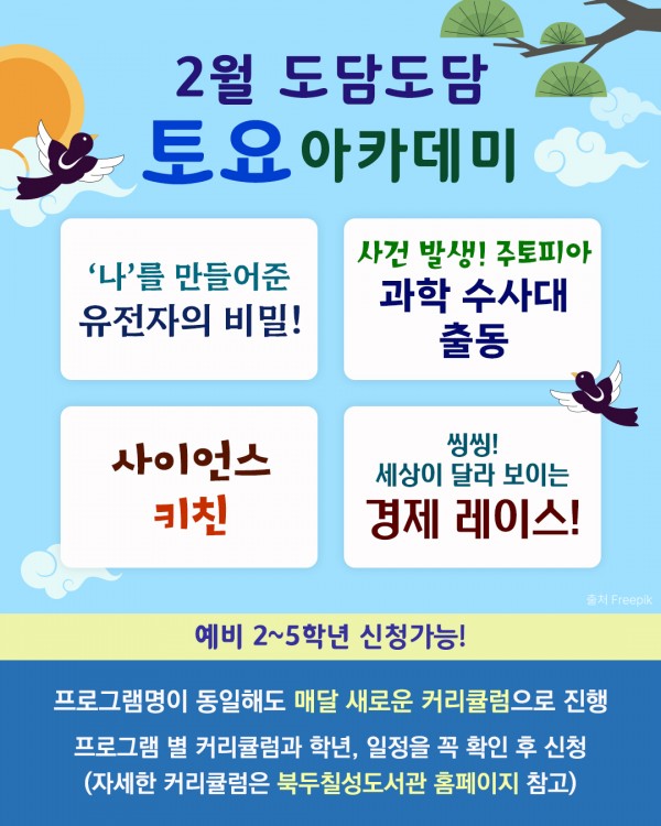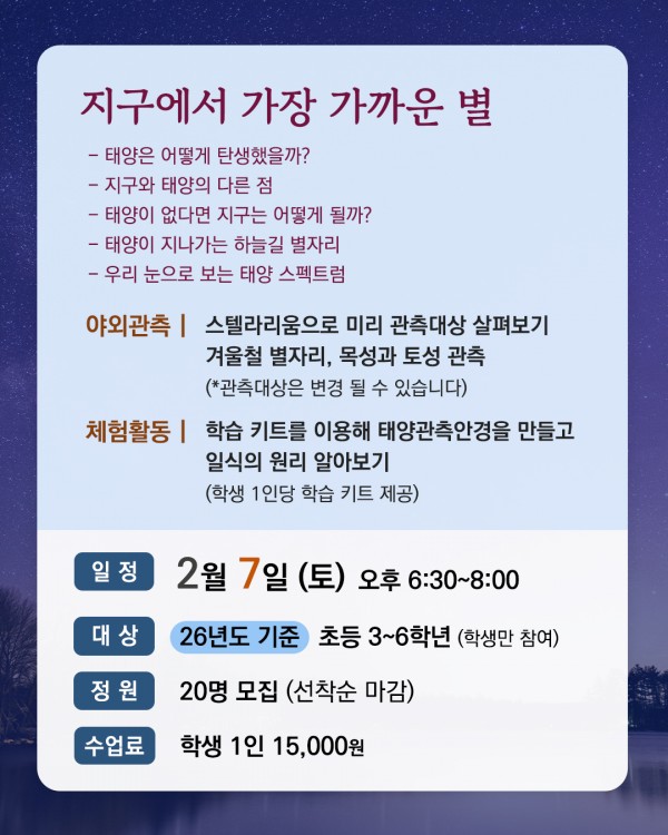도담도담 토요 아카데미, 북두칠성도서관으로 나랑 별보러 가지않을래? 페이지 정보 작성자관리자 댓글 0건 조회 1회 작성일 26-01-23 13:39 본문 날짜 : 2026-02-07 목록 이전글도담도담 일요 아카데미, 원데이특강 26.01.23 다음글설 연휴 휴관 26.01.19 댓글목록 댓글목록 등록된 댓글이 없습니다.