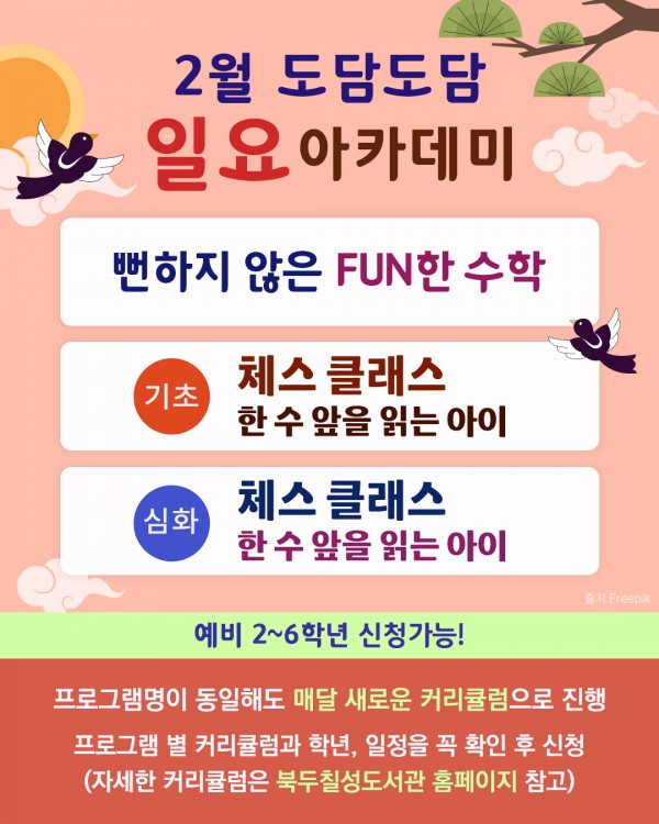 도담도담 일요 아카데미, 원데이특강 페이지 정보 작성자관리자 댓글 0건 조회 1회 작성일 26-01-23 13:46 본문 날짜 : 2026-02-22 목록 이전글원데이클래스 [茶다락방: 말차 클래스] 26.01.23 다음글도담도담 토요 아카데미, 북두칠성도서관으로 나랑 별보러 가지않을래? 26.01.23 댓글목록 댓글목록 등록된 댓글이 없습니다.