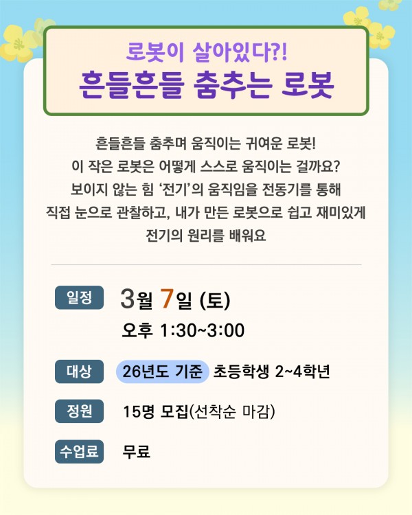 도담도담 토요 아카데미, 원데이 특강 페이지 정보 작성자관리자 댓글 0건 조회 2회 작성일 26-02-23 19:45 본문 날짜 : 2026-03-07 목록 이전글도담도담 일요 아카데미, 원데이특강 26.02.23 다음글정기 휴관일 26.02.22 댓글목록 댓글목록 등록된 댓글이 없습니다.