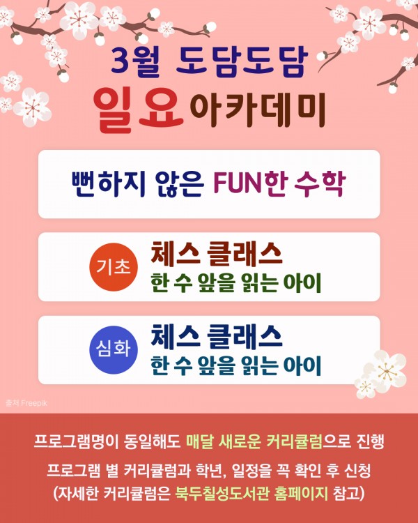 도담도담 일요 아카데미, 원데이특강 페이지 정보 작성자관리자 댓글 0건 조회 2회 작성일 26-02-23 19:49 본문 날짜 : 2026-03-15 목록 이전글도담도담 토요 아카데미, 원데이특강 26.02.23 다음글도담도담 토요 아카데미, 원데이특강 26.02.23 댓글목록 댓글목록 등록된 댓글이 없습니다.