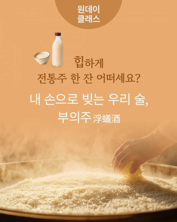 원데이클래스 [힙하게 전통주 한 잔 어떠세요?: 내 손으로 빚는 우리 술, 부의주(浮蟻酒)] 페이지 정보 작성자관리자 댓글 0건 조회 1회 작성일 26-02-23 19:56 본문 날짜 : 2026-03-27 목록 이전글독서클럽 [싱글남녀 마흔네번째 연애이야기] 26.02.23 다음글원데이클래스 [나에게 어울리는 컬러로 완성하는 퍼스널 메이크업 클래스] 26.02.23 댓글목록 댓글목록 등록된 댓글이 없습니다.