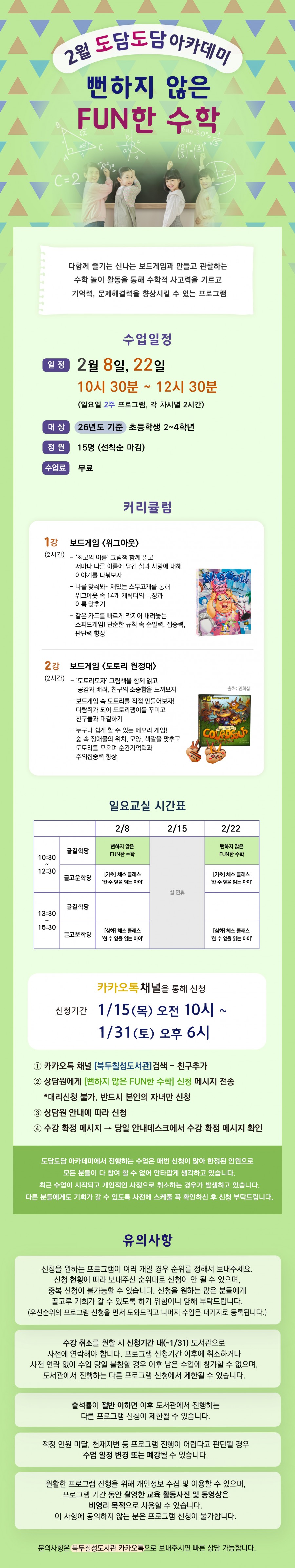 - 이전글2월 일요 아카데미) [기초] 체스 클래스 '한 수 앞을 읽는 아이' 26.01.09