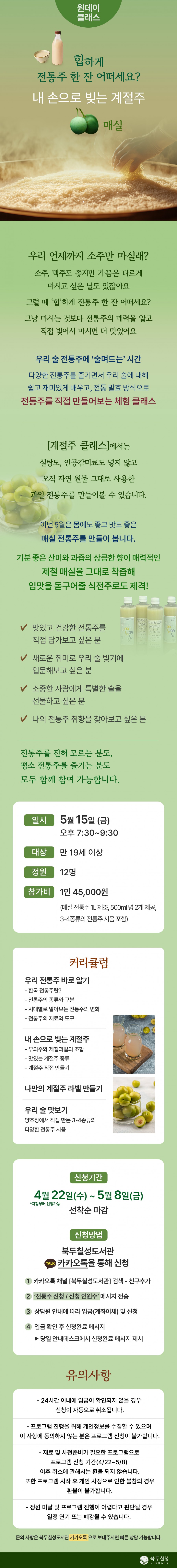 예정 5월 클래스) 힙하게 전통주 한 잔 어떠세요? 내 손으로 빚는 계절주: 매실