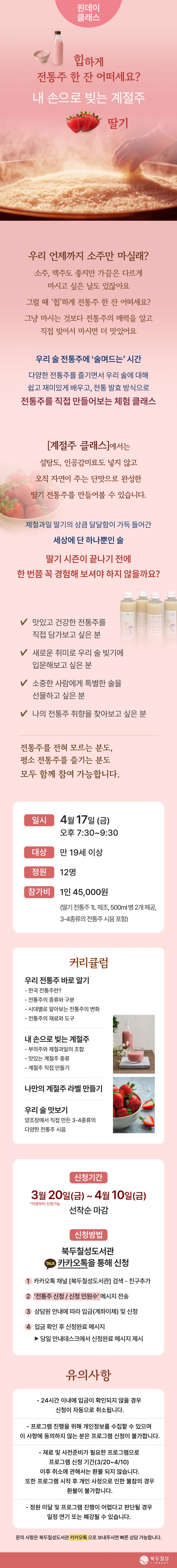 제목 : 4월 클래스) 힙하게 전통주 한 잔 어떠세요? 내 손으로 빚는 계절주: 딸기