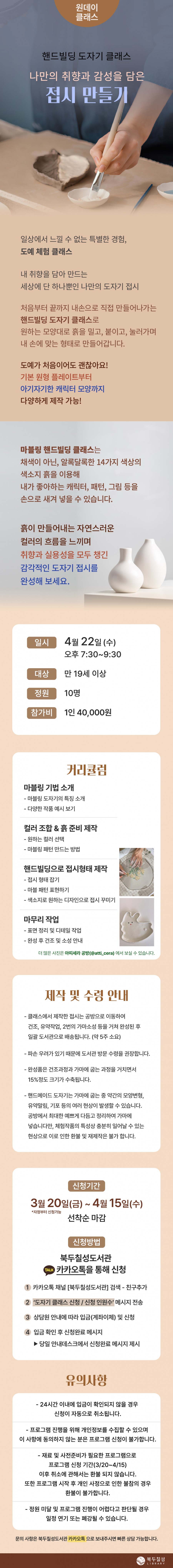 제목 : 4월 클래스) 핸드빌딩 도자기 클래스: 나만의 취향과 감성을 담은 접시 만들기