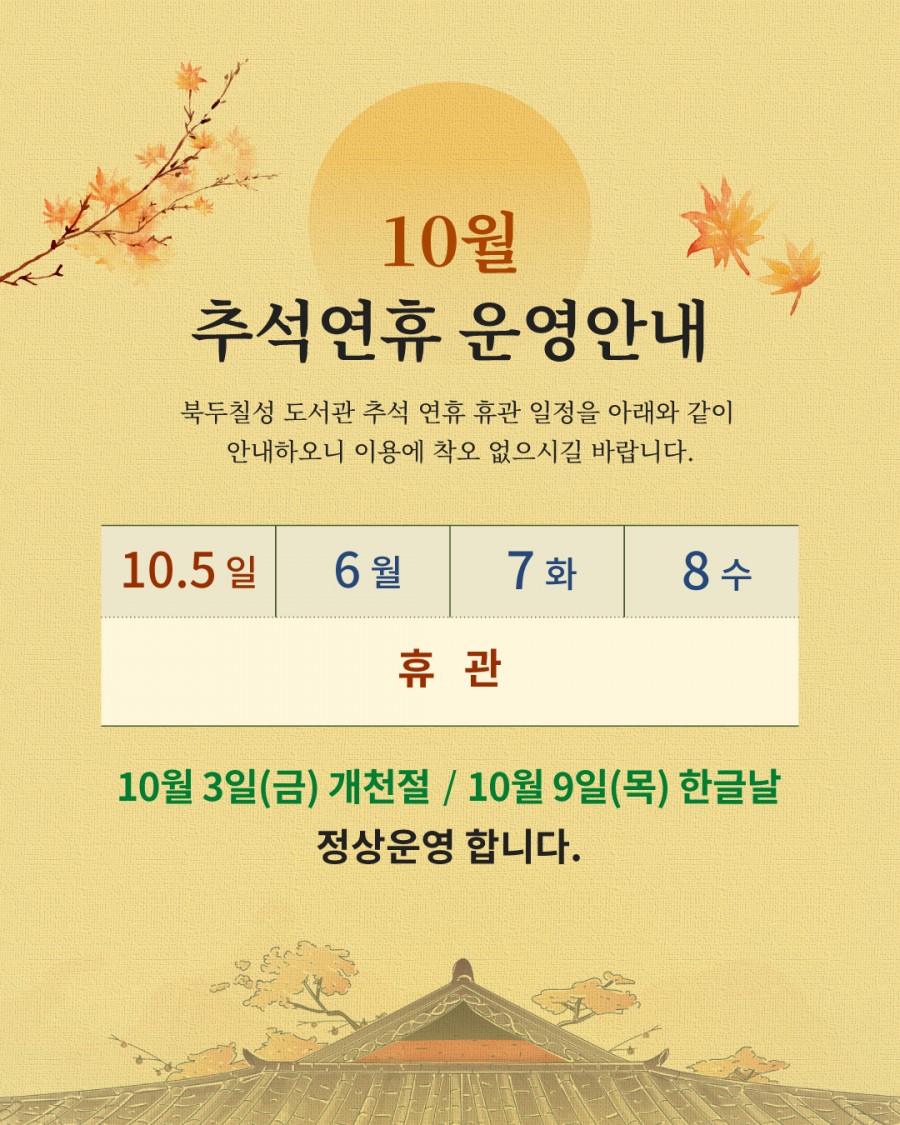 - 10월 5일(일) ~ 8일(수) 휴관