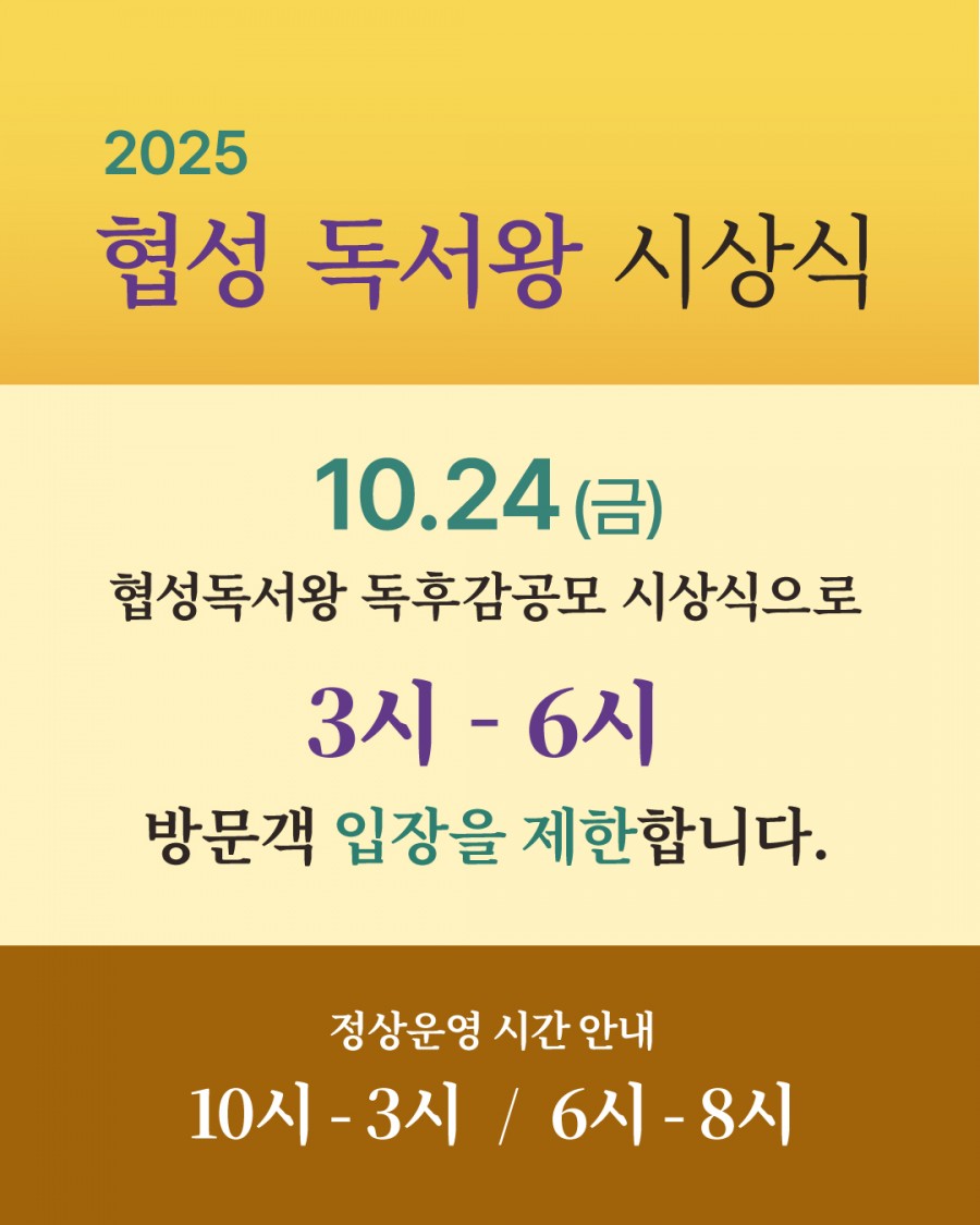 2025 제14회 협성독서왕 독후감공모 시상식으로 도서관 운영시간이 변경 되오니 이용에 참고 부탁드립니다.
